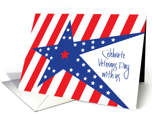 Invite your friends and family to your Veterans Day celebration this year with this patriotically colored red, white and blue invitation. It features a huge blue star that stretches its long points across the entire card, with diagonal red and white stripes filling in the background behind it. Tiny white stars decorate the blue star, with a central red star at its center. To the right, in blue hand lettering, are the invitation's words, "Celebrate Veterans Day with us". The inside has party details for you to complete online as they are being ordered.