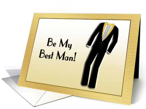 "Be My Best Man" invitation, gold textured border, tuxedo, text, classy, sophisticated