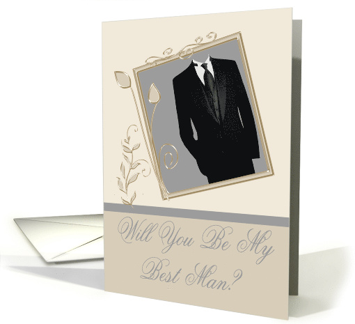 Ask someone special to be your best man with a card featuring a tuxedo in a silver, flowered frame with fancy elements.