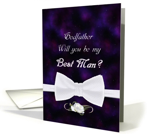 Elegant white bow tie on purple lights background and white rose to match white rose wedding series for a striking best man request card to godfather. This beautiful wedding series has matching cards for everyone on your attendants list.