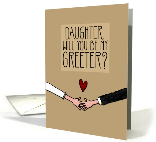 Artist Notes: | Ask your daughter to be your greeter with this contemporary wedding party invitation. Kraft paper look background features illustrated arms of a wedding couple coming in from the side of the card. Above the clasped hands is a heart. |