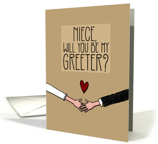 | Artist Notes: | Ask your niece to be your greeter with this contemporary wedding party invitation. Kraft paper look background features illustrated arms of a wedding couple coming in from the side of the card. Above the clasped hands is a heart. |