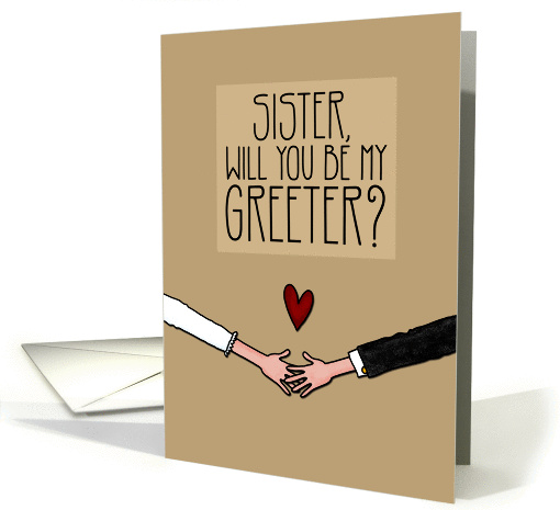 Artist Notes: | Ask your sister to be your greeter with this contemporary wedding party invitation. Kraft paper look background features illustrated arms of a wedding couple coming in from the side of the card. Above the clasped hands is a heart. |