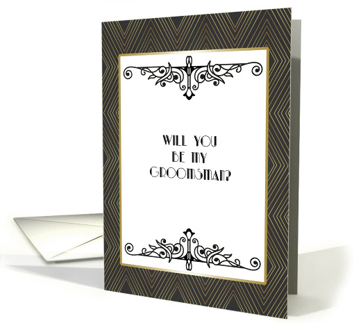 This striking card in an elegant art deco style is a great way to invite someone as a Groomsman on your wedding day. The border is a black and gold diamond pattern and the white text area includes ornate black scrolls on a white background, trimmed in gold.