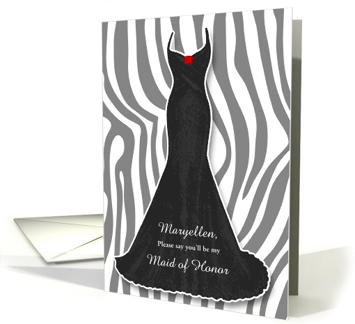 Love animal print, but want that classic formal wedding look? Invite your best friend or close family member to be your maid of honor by customizing the front of this greeting featuring a lovely black gown with a faux ruby gem and a background of zebra print.