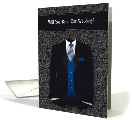 Soft and deep gray hues swirl with a pale golden hue on the background of this tuxedo themed wedding attendant request.