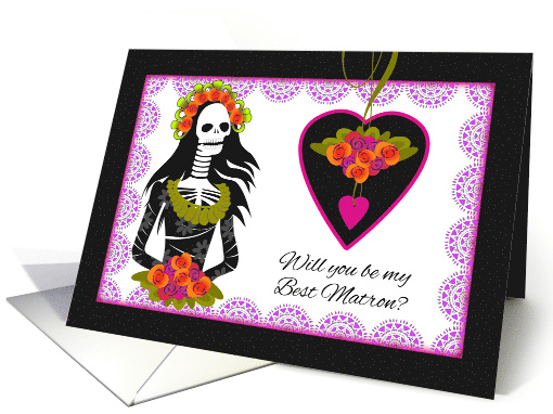 Will you be my Best Matron? Wedding attendant invitation for a best matron to serve in a Dia de los Muertos themed wedding celebration. Colorful flowers, digital paper cut outs, and framed in black. Female skeleton thanks to stilg4r/Openclipart.