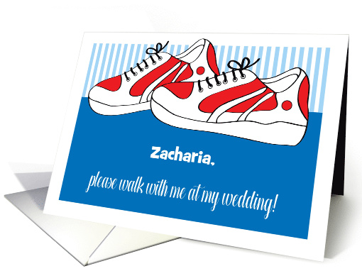If you want your grandson to walk with you at your upcoming wedding, give this colorful custom card to him. The cover features red and white sport shoes on a blue background and blue stripes. The custom name is in white towards the bottom of the card. The headline is white. You may change the inside message, if you wish. ©Gail Pepin