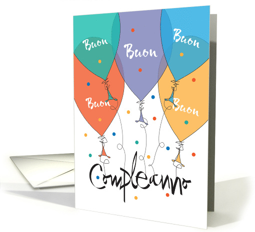 This is a colorful birthday card with hand lettered wording of "Buon Compleanno" for those that speak Italian (In English: "Happy Birthday"). The card's five colorful balloons hoover at the top of the white card in colors of pink, yellow, lavender, blue and teal green. White wording on each balloon says "Buon" and across the bottom, in black hand lettering, says "Compleanno". The card's inside wording says "Buon divertimento!" (In English: "Have fun!") Questa carta ha palloncini coloratti e dicitura che dice "Buon Compleanno" in Italiano (In English: "Happy Birthday").