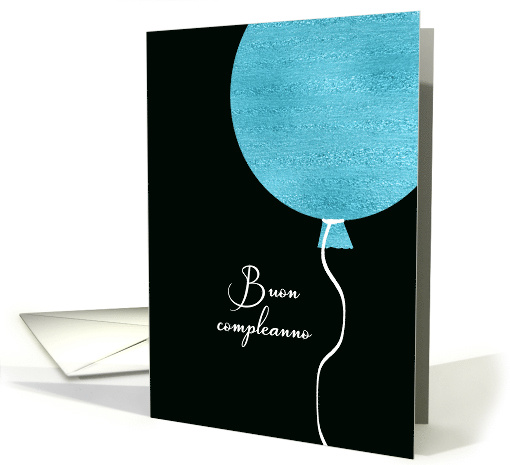 A modern, contemporary Birthday card in Italian. Translation text front of card: Happy Birthday (Buon Compleanno), text inside: best wishes (tanti auguri). Balloon is a blue Glitter/Foil effect. Text inside card can be modified.