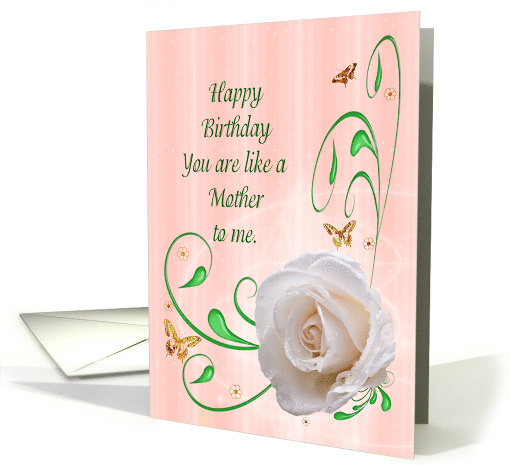 | Artist Notes: | A fun and happy birthday card for someone who is like a mother. A white rose with green swirls and flighty butterflies flitting around. the background is pink with white stripes. |