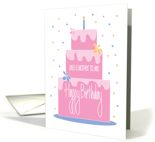 "Happy Birthday - Like a Mother to Me" is hand lettered white wording that is stacked on this beautiful pink birthday cake of three layers, with dripping light pink frosting. A blue, a yellow and a small pink flower decorate each of the layers, on top of the frosting. A single candle embellishes the top of the tall cake. Confetti of yellow, blue and pink dot the white background festively. The inside wording of the card says "Wishing you a wonderful day that sparkles with happiness, with love!"