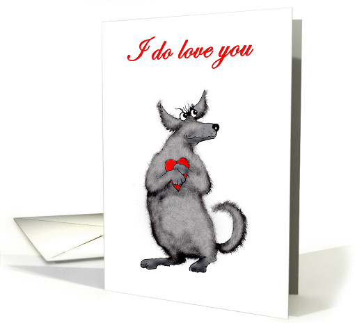 | Artist Notes: | This card depicts a grey shaggy dog holding a red loveheart to its chest, on a white background. "I do love you" is written in red Edwardian script. Drawing, and artwork by Mary Taylor. |