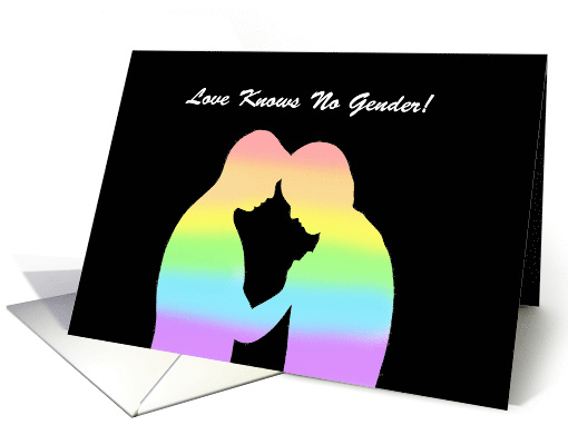 | Artist Notes: | Love/romance card with a rainbow silhouette of a male couple touching heads and heart. The words on the front say, Love knows no gender! Inside says, Our love knows no restrictions |