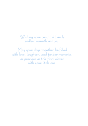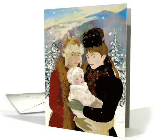 A vintage-style greeting card featuring two women as a loving couple holding their baby. They are dressed in elegant winter furs with subtle ethnic touches, gloves, hats, and jewelry. The baby is wrapped in white furs and a cozy hat. Behind them, snowy fir trees, with snowflakes falling softly and drifts of snow and blue mountains set a magical scene. All three look toward the viewer, as if posing for a timeless family portrait. A heartfelt card that celebrates love, family, and togetherness in a nostalgic winter setting.