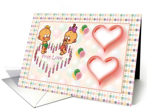 Two charming characters, a boy and a girl, with candles set out in a heart shape.