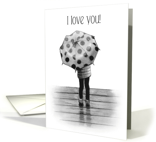 A small girl stands on a wet dock holding her polka-dotted umbrella in this pencil drawing. Words say "I love you!". Inside it says, "Rain or shine, I'm glad you're mine!", but, as always, this part of the card may be edited, if desired.