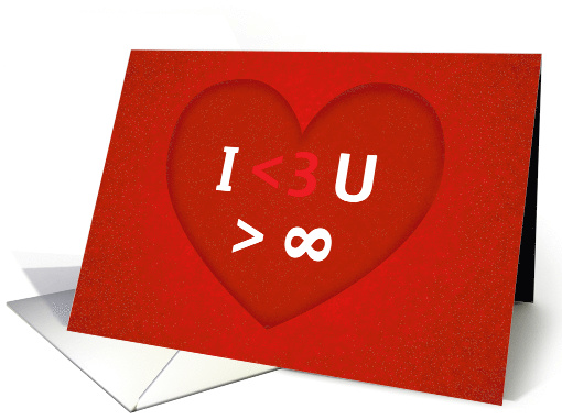 "I love you greater than infinity" symbols in a red heart on a speckled red background. Message in math symbols / text-speak. Sweet card for your secret crush or love interest to decode.