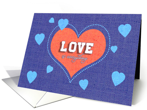 Beautiful color combination of Orange and violet with blue little hearts gives a romantic feel. The text "LOVE is everything" express the soul thoughts. The blue dotted heart shaped frame in outside the orange heart is a jewel to Love. Note: Background cloth texture is digitally created.