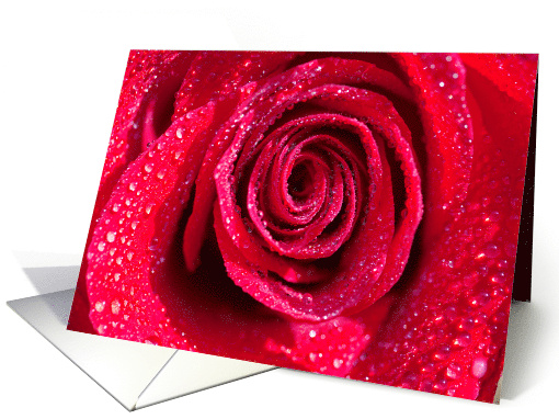 This close-up of a red rose adorned with glistening raindrops creates a stunning love card, perfect for expressing heartfelt romance to a partner, spouse, or special someone.