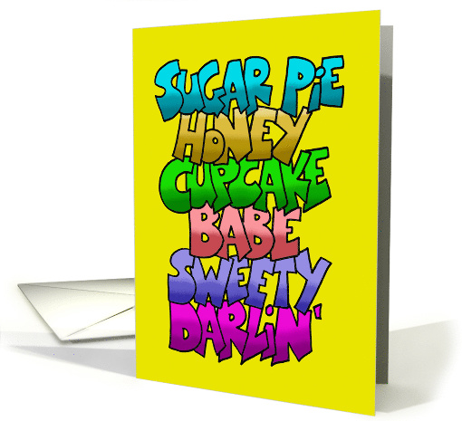 Colorful words saying, Sugar Pie, Honey, Cupcake, Babe, Sweety, Darlin'. Inside says I have a lot more, but I was afrid the card would ignite!