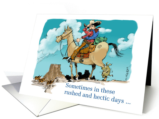 Our cartoon western horseman is busy in the western landscape. He's out on the range paying attention to the cattle, the vast landscape, his saddle sores and the sorry horse he wound up with. He's absolutely not paying attention to the thing that loves him the most; the camp dog.
