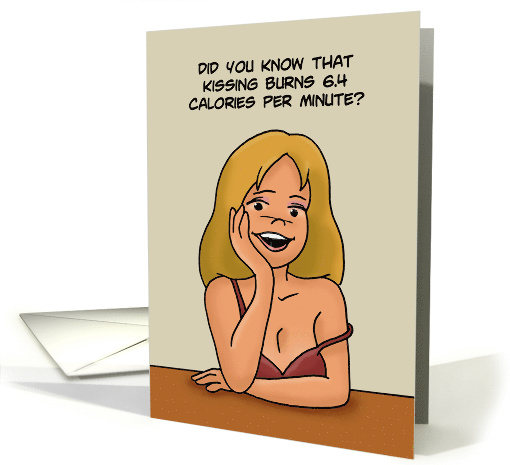 Humorous Love/Romance card with a cartoon woman flirting. The words say: Did you know that kissing burns 6.4 calories per minute? Inside says: Wanna workout?