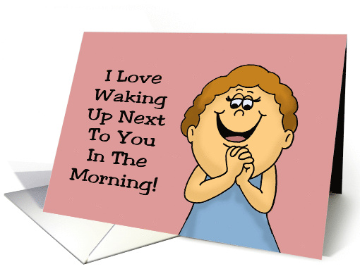 Humorous Love/Romance card with an cartoon woman on a pink background. The words say: I love waking up next to you in the morning! Inside says: Just don't breathe on me! I Love You