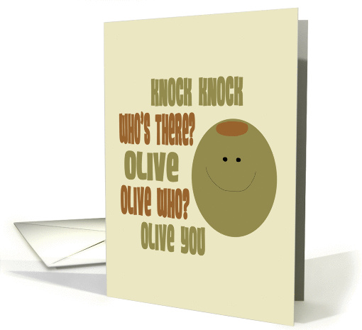 A sweet and funny way to say "I love you" to an olive lover. This card features a knock, knock joke and a smiling olive.