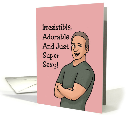 Humorous Love/Anniversary Card with a cartoon man on a pink background. The words say: Irresistible, adorable and just Super Sexy! Inside says: You're not too bad either! Just kidding, I love you!