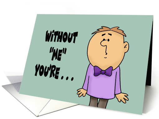 Humorous Love/Romance card with a cartoon man on a green background. The words say: Without "ME" you're . . . Inside says: . . . just aweso! I love you
