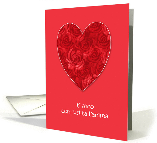 | Artist Notes: | Tell that special person how much you love him/her with this card in Italian language featuring a heart filled with roses. Front:"I love you with all my heart" in Italian. Text inside is editable and you can modify according to your wishes (color,font,message,size). |