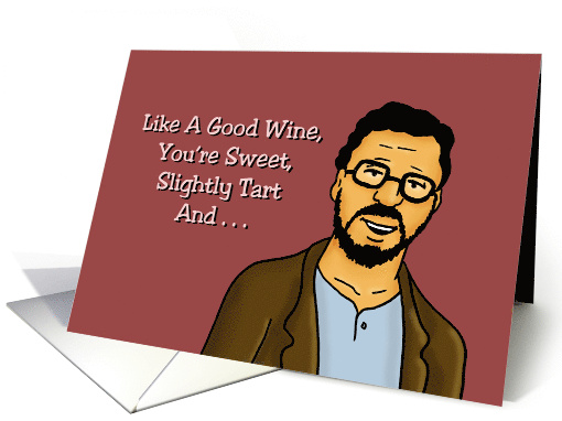 | Artist Notes: | Humorous Love/Romance card for her with a cartoon man on a maroon background. The words say: Like a good wine, you're sweet, slightly tart and . . . Inside says: . . . full-bodied! |