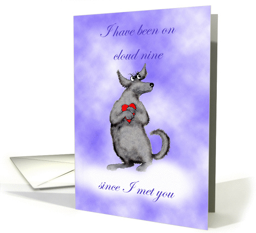 | Artist Notes: | This card depicts a grey furry dog holding a red love heart to its chest, nd sitting on a cloud in a blue sky."I have been on cloud nine since I met you" is written across the top and bottom of the picture. Drawing and artwork by Mary taylor. |