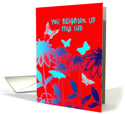 | Artist Notes: | Bright teal butterflies and blue flowers (graphic style) set against a bright red background convey the message: You brighten up my life. Perfect for that special person in your life. You can personalize message inside. |