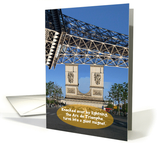 Toppled over by lighting, the Arch of Triumph (Arc de Triomphe) has been miraculously transformed into a magnet. What's more this amazing newly minted lodestone has yanked the Eiffel Tower from it's foundation and it's now stuck to the end of the upended arch. Not ones to been easily unnerved by even an event sod bizarre, the Parisians busy themselves with their daily routines, driving down the Champs-Élysées, marching along the sidewalks, and so on. It's a beautiful day. the sky is blue. Some feathery clouds appear in the distance.