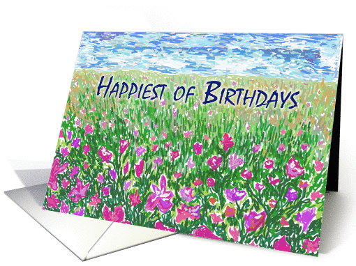 A spring meadow with green grass and pink/purple flowers cover the bottom 3/4 of the card with a blue sky in the background. Navy blue, thin lettering saying "Happiest of Birthdays" sits on top of the green grassy field. The card looks like a beautiful sunny spring day.