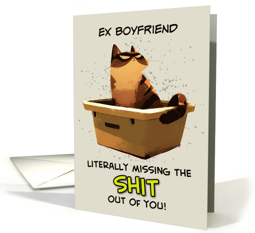 A miffed cat sitting in his litter box on a beige background with grunge splatter effect and the text "Ex Boyfriend literally missing the shit out of you!" A fun card to send to your wonderful ex boyfriend who's not with you right now.