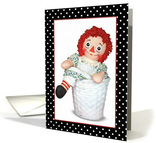 Rag doll in a wicker basket with polka dot frame for Missing You.