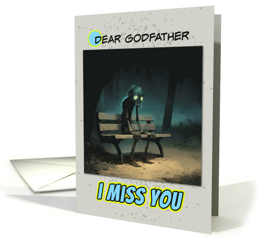 Artist Notes: A skeletal zombie sits alone on a park bench in a dark, misty forest setting. The figure has glowing yellow eyes and appears to be hunched over in a posture suggesting sadness or loneliness. The atmosphere is moody and melancholic, with a teal-green glow illuminating the scene. The card's text is presented in a casual, almost comic book style: "I MISS YOU" at the bottom in bright blue and yellow outlined text. The contrast between the whimsical, bright text and the somber, haunting image creates a striking and somewhat morbid take on a typical miss you card. It seems designed to convey a sense of longing or absence in an unconventional, possibly humorous way, depending on the relationship and shared sense of humor between the sender and recipient.