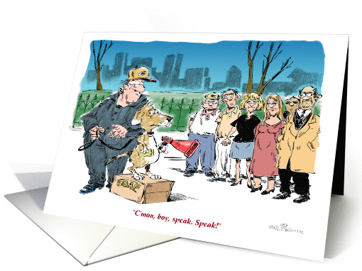 The owner in the cartoon park is trying to get the dog to speak publicly to the standing audience in this cartoon. The pooch looks anxious about public speaking. I believe the subject might be neutering or spaying. Looking at the audience some of them might need it ...