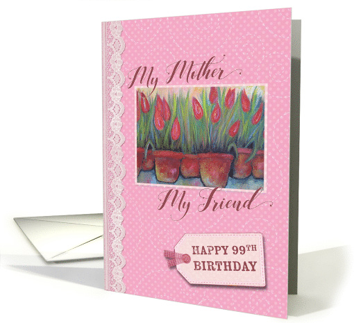 Celebrate your Mother's 99th birthday with this pretty pink card with a delicate swirl pattern background, featuring a painting of potted tulips, and a scrapbook effect digital tag with gingham and button accent. Designed by Rycky Creations; painting by Robin Chaffin.