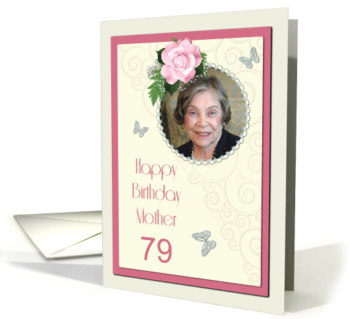 | Artist Notes: | Add your photo to personalize a unique and stunning birthday card for your mother's 79th birthday. Place your picture inside the diamond encrusted frame. A beautiful pink rose and jewelled butterfly completes the look. A very stylish and modern birthday card. All parts are printed. |