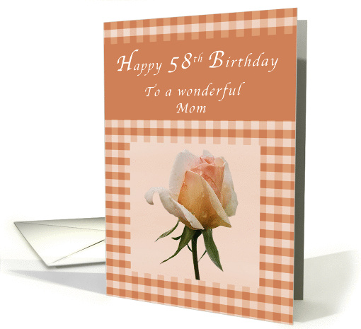 A beautiful peach rose with a gingham pattern backdrop makes a nice card to give your Mother on her 58th Birthday.