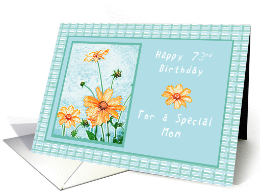 A beautiful orange flowers with a pastel blue and green gingham pattern backdrop. A card your Mother is sure to enjoy on her 73rd birthday.