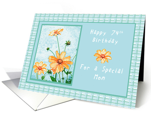 A beautiful orange flowers with a pastel blue and green gingham pattern backdrop. A card your Mother is sure to enjoy on her 74th birthday.