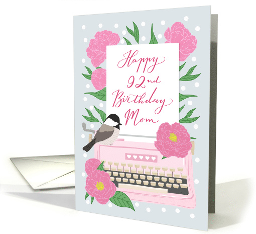 A pink vintage typewriter surrounded by flowers and leaves with a chickadee bird perched on the typewriter. A piece of paper from the typewriter has the handwritten words Happy 92nd Birthday Mom. A lovely birthday card for your mom turning 92!
