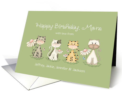 Sweet birthday card for a mother who has four children, or from husband and three children, or for a mother who simply likes cats! The card front can be personalized with the family names. Card designed by Simply Put by Robin; clipart ©Country Life Graphics.