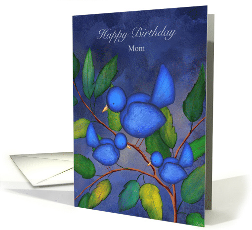 Three blue birds sit inside greenery. One mom bird alongside her baby birds. Different shades of green leaves over a moody dark blue background. The birds are bright and happy. Original art by the artist.