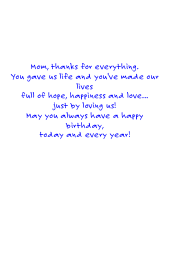 Inside: Mom, thanks for everything. You gave us life and you've made our lives full of hope, happiness and love... just by loving us! May you always have a happy birthday, today and every year!